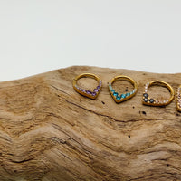 A titanium clicker coated in PVD Gold lined with different colors of beautiful CZ stones! stunning for a septum or daith piercing.
