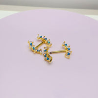 Pretty alternating Clear CZ and Pacific Blue Opals on this beautiful PVD IP Gold-dipped nipple bar!
