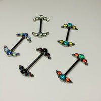 This nipple bar comes with a cluster of blue and red CZ stones and titanium beads! Ideal for those that want to wear amazing looking showstopper jewelry.